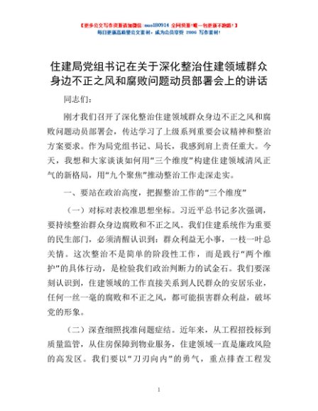 / 住建局党组书记在关于深化整治住建领域群众身边不正之风和腐败问题动员部署会上的讲话