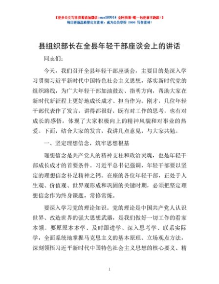 / 县组织部长在全县年轻干部座谈会上的讲话