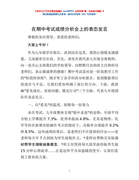 / 在期中考试成绩分析会上的表态发言