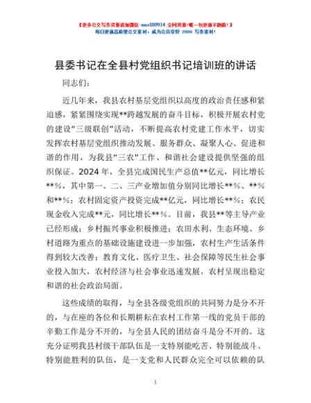 / 县委书记在全县村党组织书记培训班的讲话