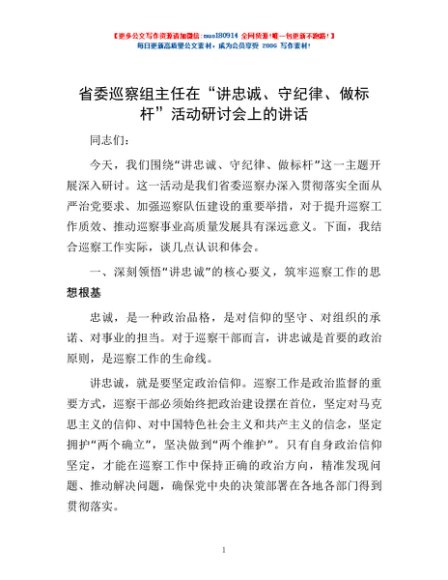 / 省委巡察组主任在“讲忠诚、守纪律、做标杆”活动研讨会上的讲话