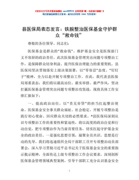 / 县医保局表态发言:铁腕整治医保基金 守护群众“救命钱”