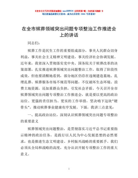 / 在全市殡葬领域突出问题专项整治工作推进会上的讲话