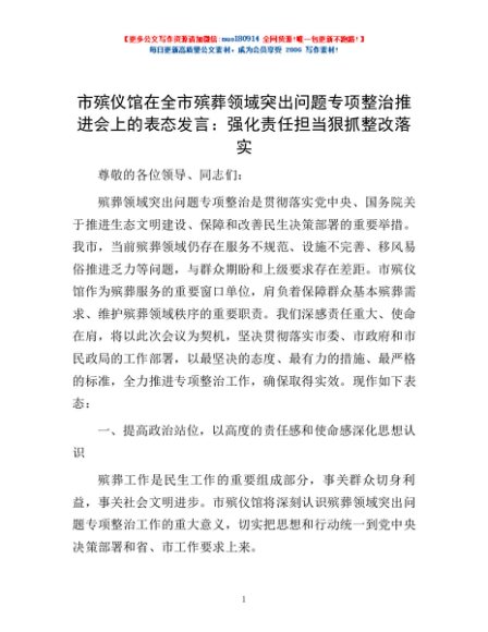 / 市殡仪馆在全市殡葬领域突出问题专项整治推进会上的表态发言:强化责任担当狠抓整改落实
