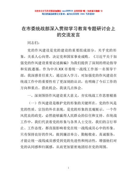 / 在市委统战部深入贯彻学习教育专题研讨会上的交流发言
