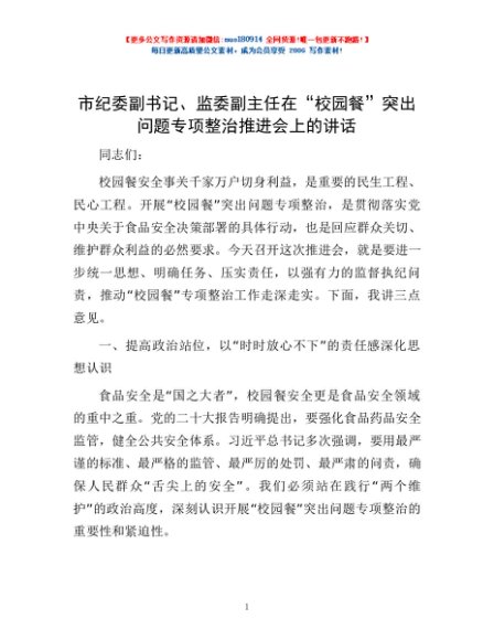 / 市纪委副书记、监委副主任在“校园餐”突出问题专项整治推进会上的讲话