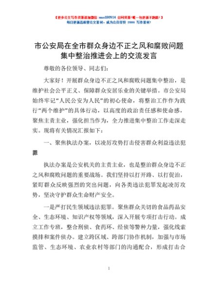 / 市公安局在全市群众身边不正之风和腐败问题集中整治推进会上的交流发言