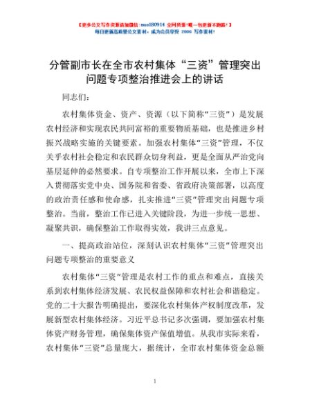 / 分管副市长在全市农村集体“三资”管理突出问题专项整治推进会上的讲话