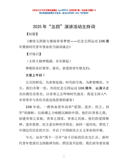 / 2025年“五四”演讲活动主持词