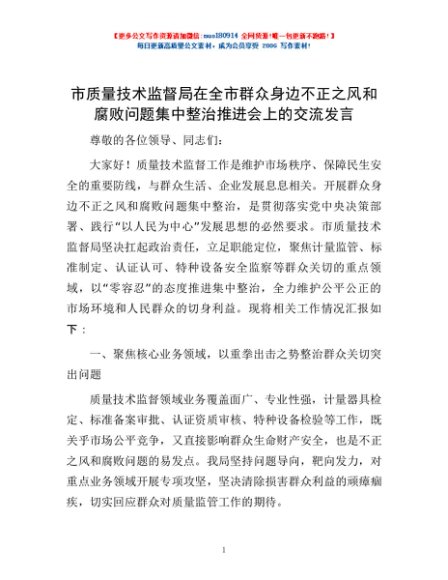 / 市质量技术监督局在全市群众身边不正之风和腐败问题集中整治推进会上的交流发言