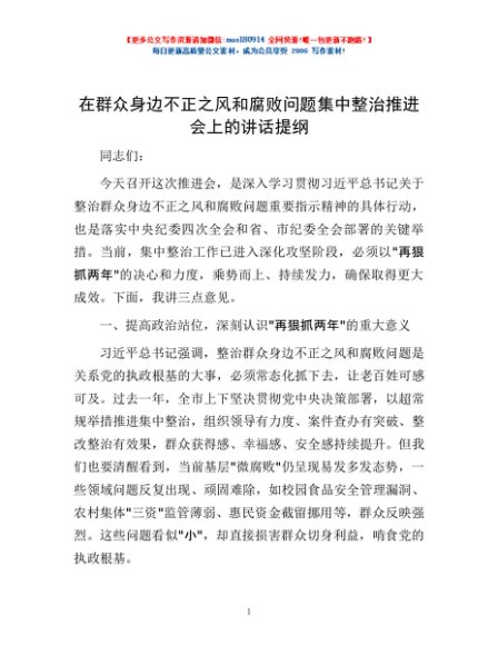/ 在群众身边不正之风和腐败问题集中整治推进会上的讲话提纲