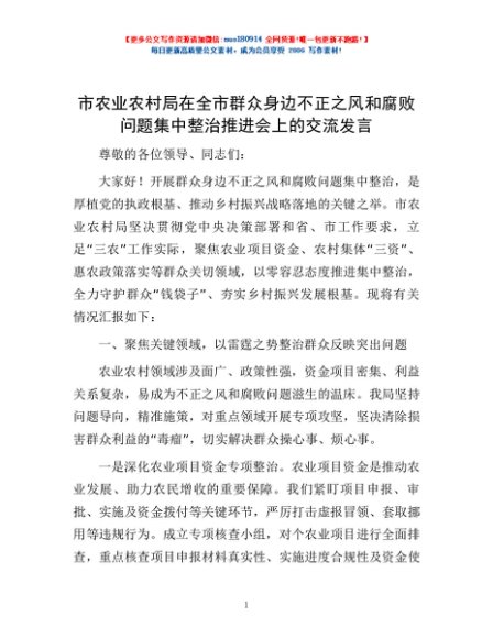 / 市农业农村局在全市群众身边不正之风和腐败问题集中整治推进会上的交流发言