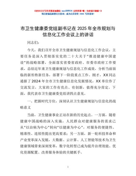/ 市卫生健康委党组副书记在2025年全市规划与信息化工作会议上的讲话