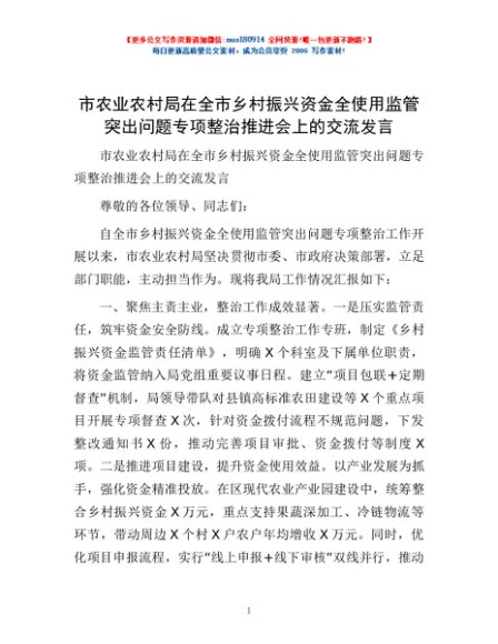 / 市农业农村局在全市乡村振兴资金全使用监管突出问题专项整治推进会上的交流发言