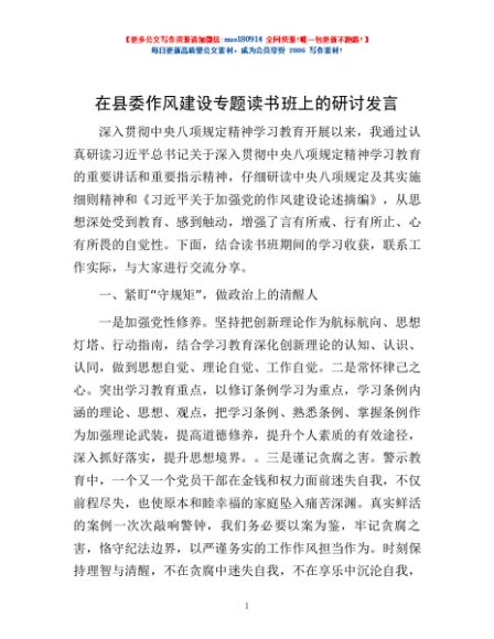 / 在县委作风建设专题读书班上的研讨发言