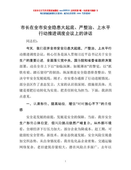 / 市长在全市安全隐患大起底、严整治、上水平行动推进调度会议上的讲话