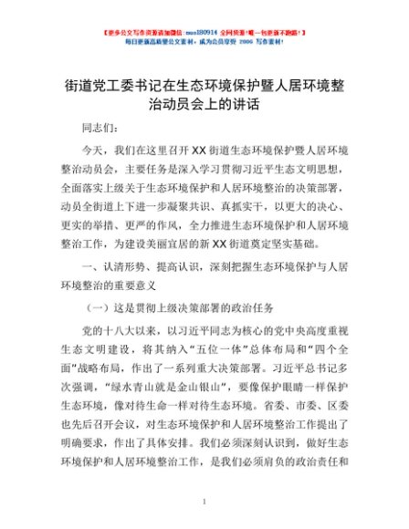 / 街道党工委书记在生态环境保护暨人居环境整治动员会上的讲话