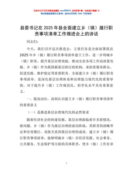 / 县委书记在2025年县全面建立乡(镇)履行职责事项清单工作推进会上的讲话