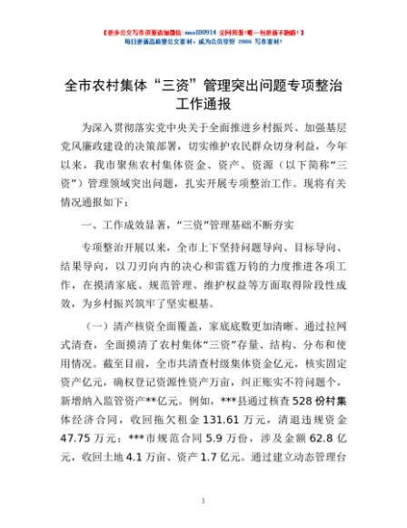 全市农村集体“三资”管理突出问题专项整治工作通报