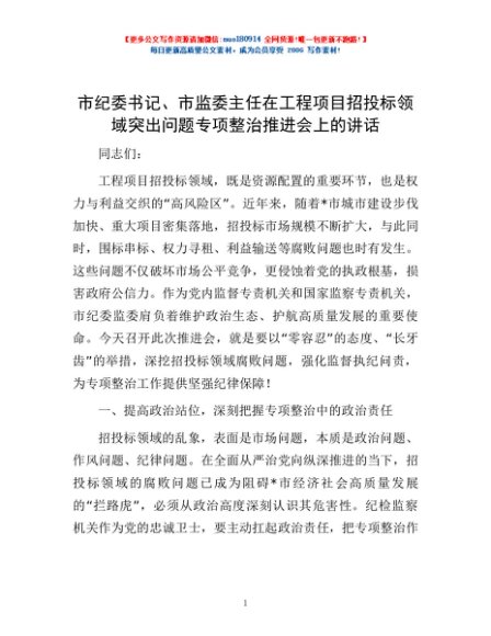 / 市纪委书记、市监委主任在工程项目招投标领域突出问题专项整治推进会上的讲话