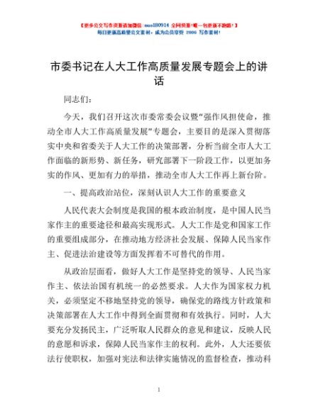 / 市委书记在人大工作高质量发展专题会上的讲话