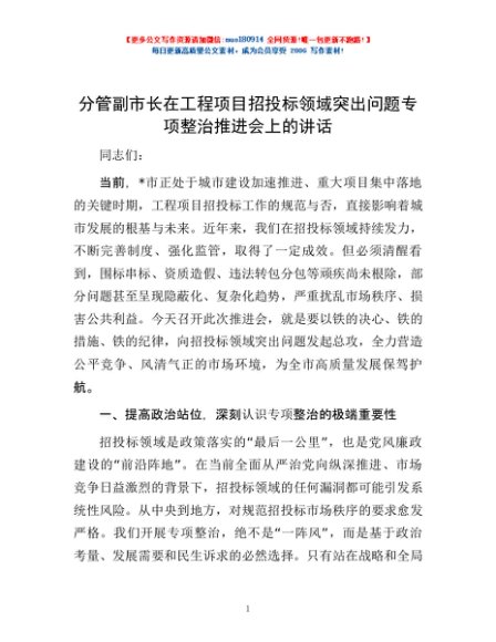 / 分管副市长在工程项目招投标领域突出问题专项整治推进会上的讲话