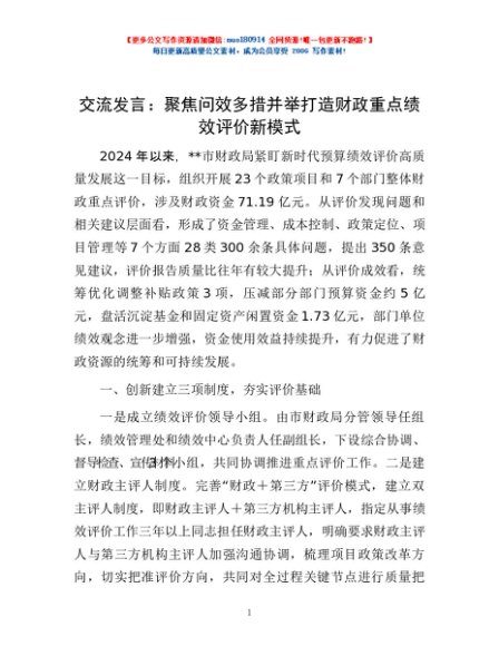 / 交流发言:聚焦问效多措并举 打造财政重点绩效评价新模式