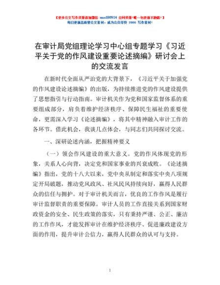 / 在审计局党组理论学习中心组专题学习《习近平关于党的作风建设重要论述摘编》研讨会上的交流发言