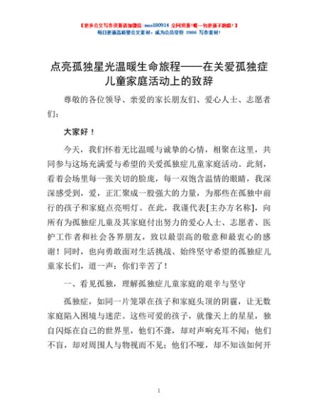 / 点亮孤独星光 温暖生命旅程——在关爱孤独症儿童家庭活动上的致辞