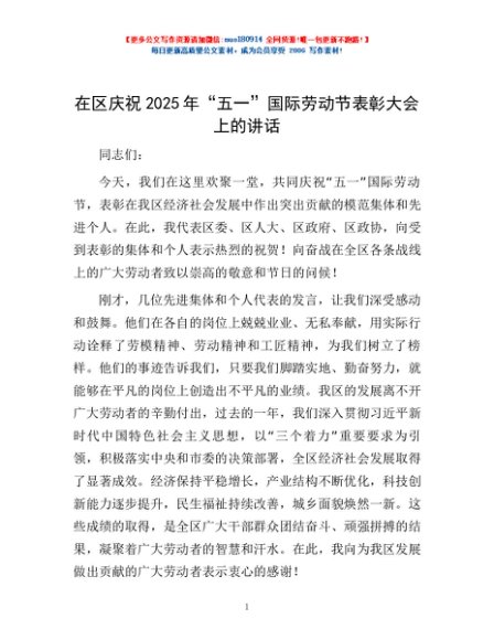 / 在区庆祝2025年“五一”国际劳动节表彰大会上的讲话