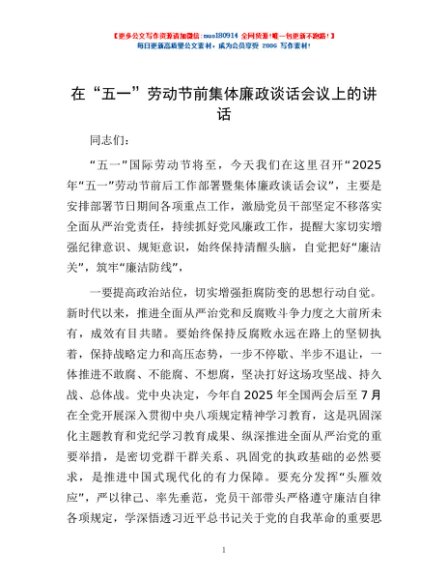 / 在“五一”劳动节前集体廉政谈话会议上的讲话