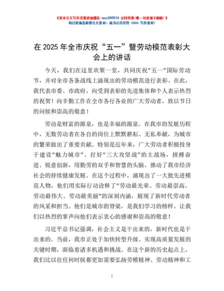 / 在2025年全市庆祝“五一”暨劳动模范表彰大会上的讲话