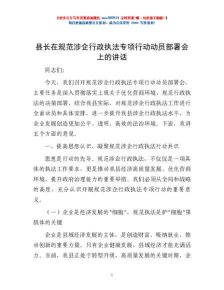/ 县长在规范涉企行政执法专项行动动员部署会上的讲话