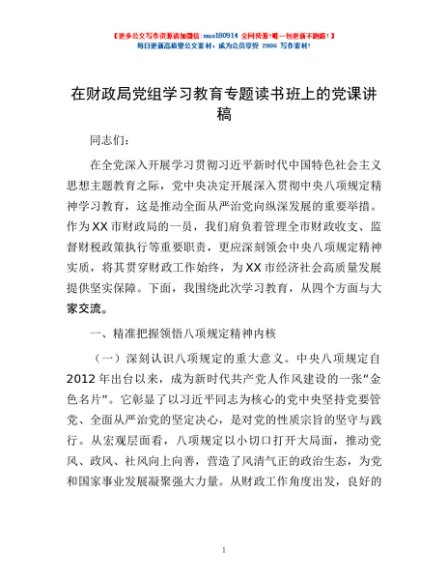 / 在财政局党组学习教育专题读书班上的党课讲稿