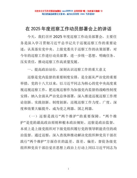 / 在2025年度巡察工作动员部署会上的讲话