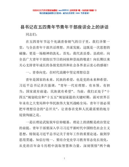 / 县书记在五四青年节青年干部座谈会上的讲话