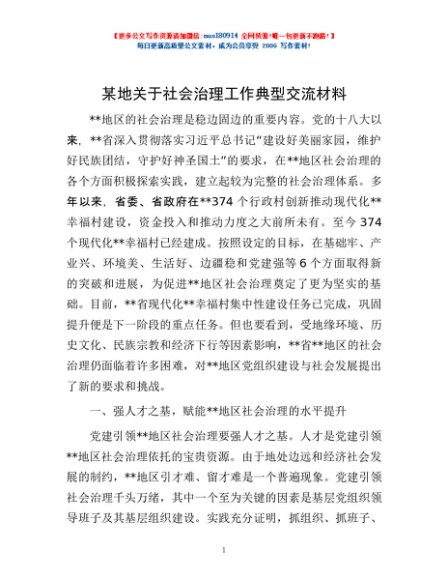 / 某地关于社会治理工作典型交流材料