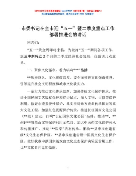 / 市委书记在全市迎“五一”暨二季度重点工作部署推进会的讲话