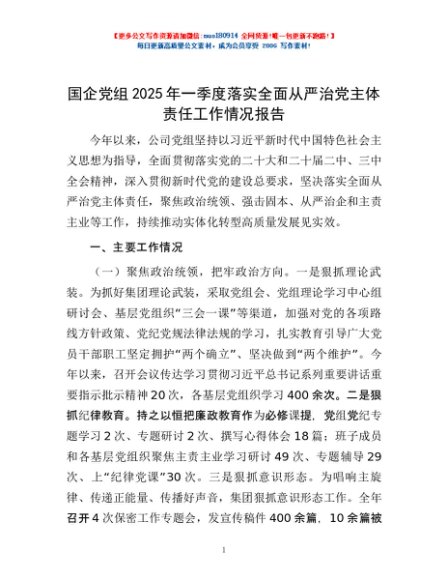 / 国企党组2025年一季度落实全面从严治党主体责任工作情况报告