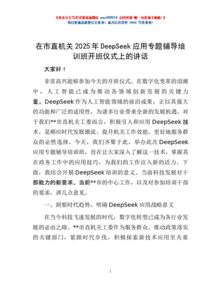 / 在市直机关2025年DeepSeek应用专题辅导培训班开班仪式上的讲话