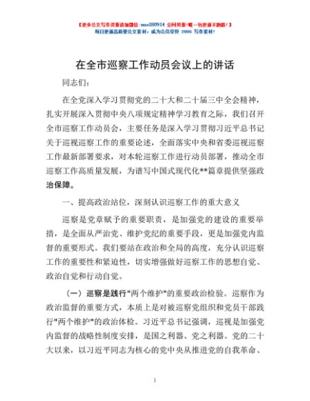 / 在全市巡察工作动员会议上的讲话