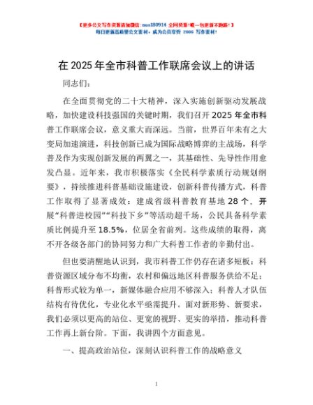 / 在2025年全市科普工作联席会议上的讲话