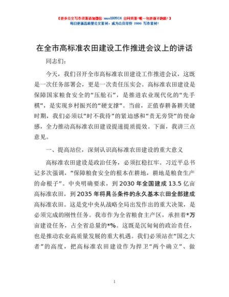 / 在全市高标准农田建设工作推进会议上的讲话