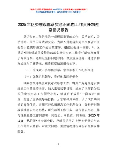 / 2025年区委统战部落实意识形态工作责任制巡察情况报告