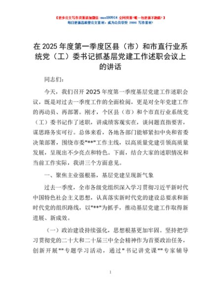 / 在2025年度第一季度区县(市)和市直行业系统党(工)委书记抓基层党建工作述职会议上的讲话