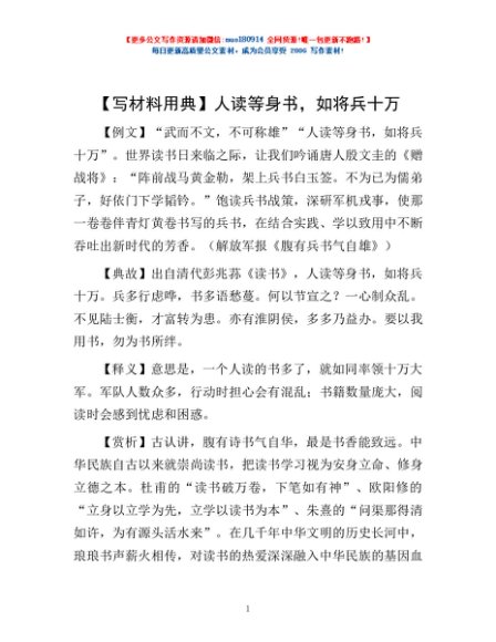 【写材料用典】人读等身书,如将兵十万