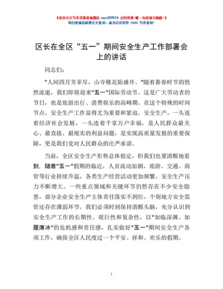 / 区长在全区“五一 ”期间安全生产工作部署会上的讲话