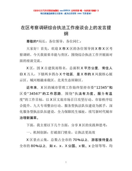 / 在区考察调研综合执法工作座谈会上的发言提纲