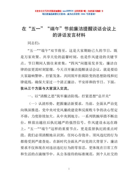 / 在“五一”“端午”节前廉洁提醒谈话会议上的讲话发言材料