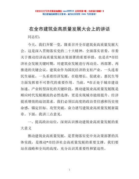 / 在全市建筑业高质量发展大会上的讲话